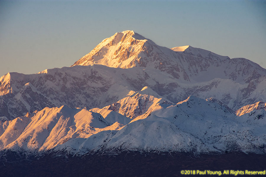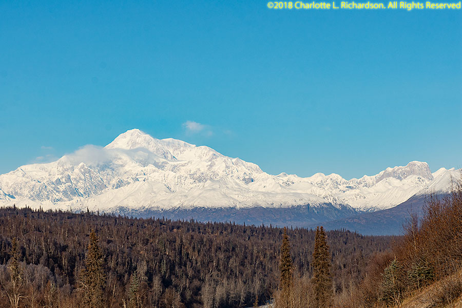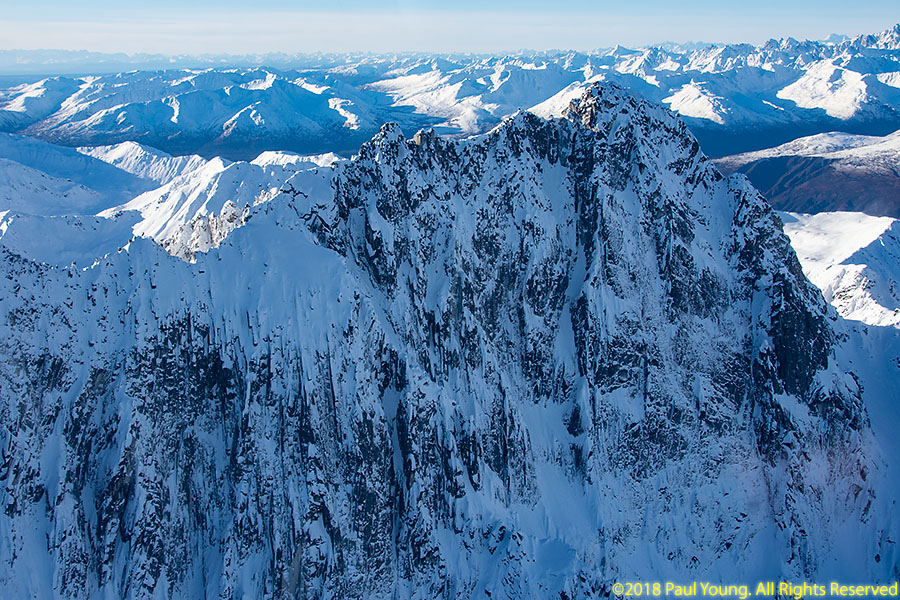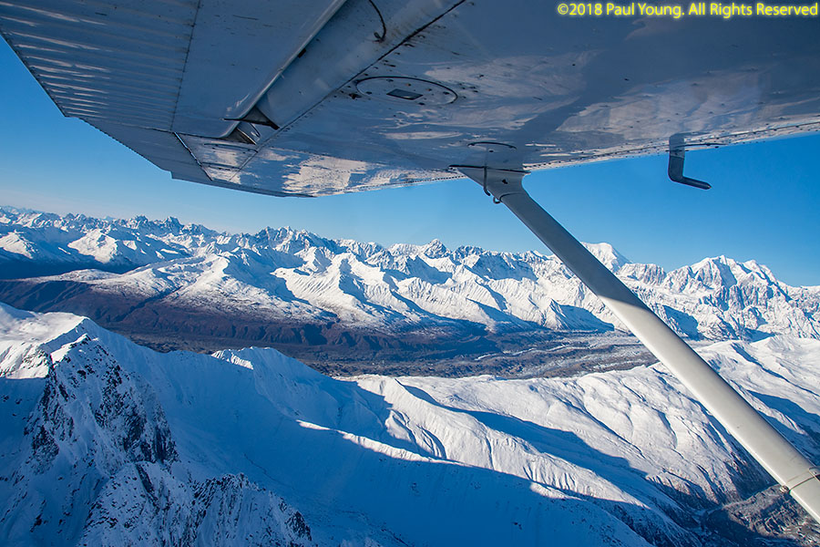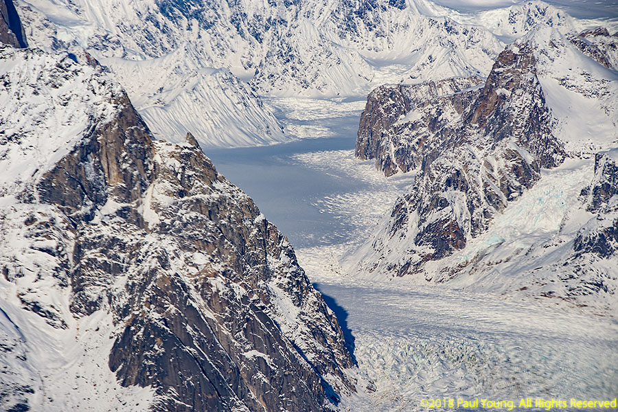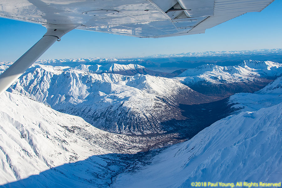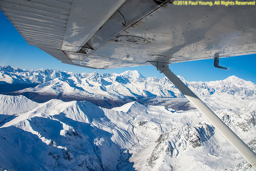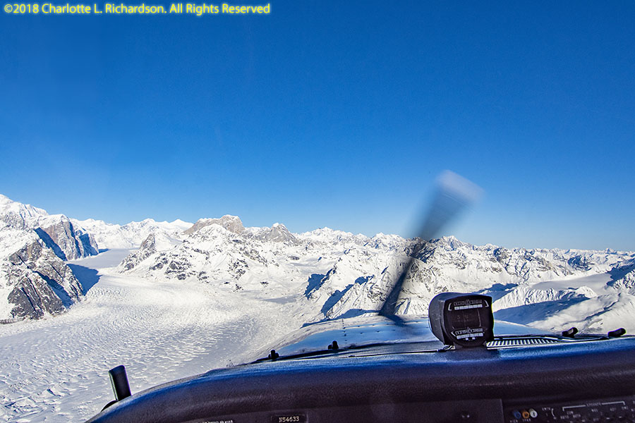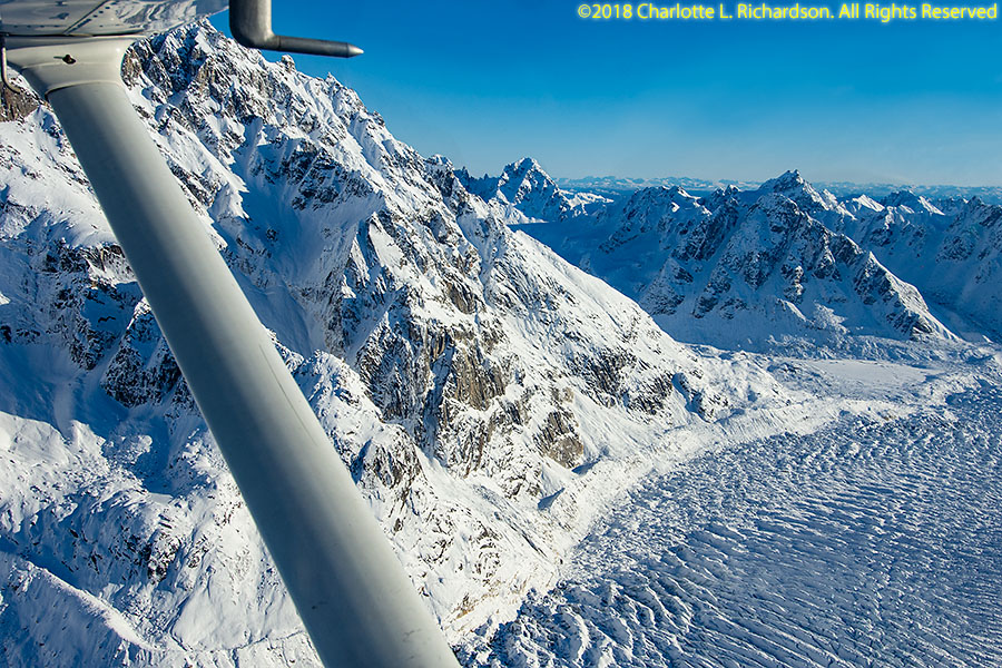 Flying the Ruth Glacier Great Gorge on Denali. I rented a Cessna 172 from Legends Aviation in Willow, and flew once again with Walt Warner. Our route took us over the foothills of the Alaska Range at 6500'. We intercepted the outflow of the Ruth Glacier and flew up into Denali, up the Great Gorge. Only two other aircraft were on the route. Another fixed-wing aircraft was behind me, and a red helicopter started up the gorge as I was coming out. Visibility was unlimited.