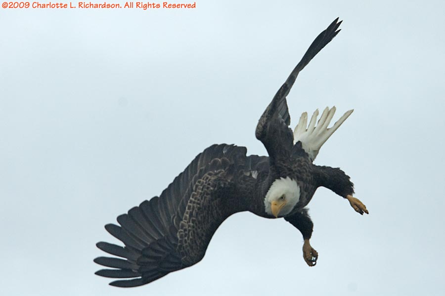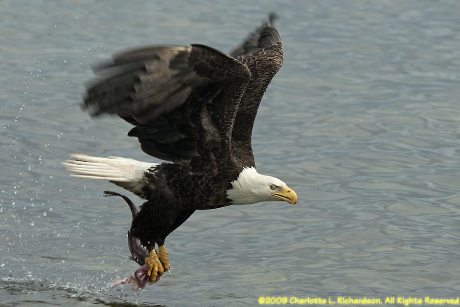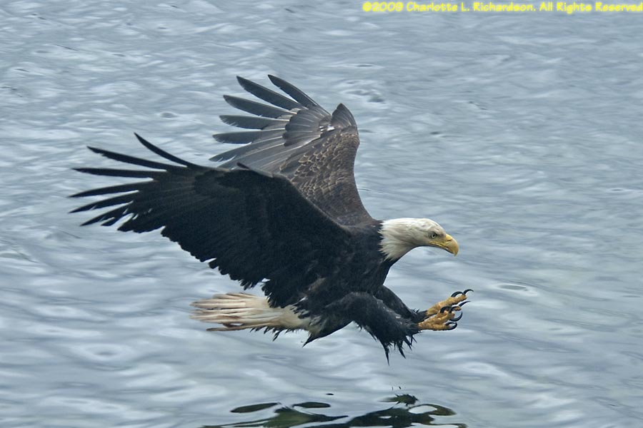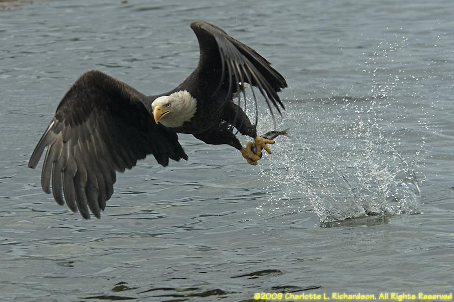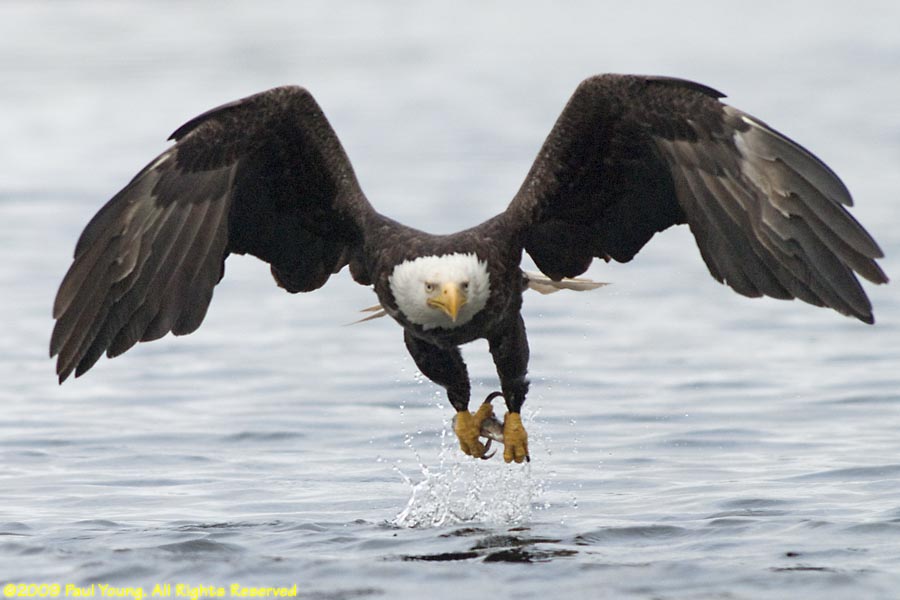 When a fishing bald eagle spots likely prey, the bird dips one wing and swoops down to the water with its legs extended. As it approaches the fish, the eagle extends its legs in front of its body and makes a rapid backward sweep to grab the prey in its talons. Eagles have semi-transparent protective eyelids that can be closed when grabbing prey. Usually the birds will land before consuming their fish, but they can eat while flying. Other eagles may try to steal the prey, either while the successful bird is flying away with its catch or after it has landed.