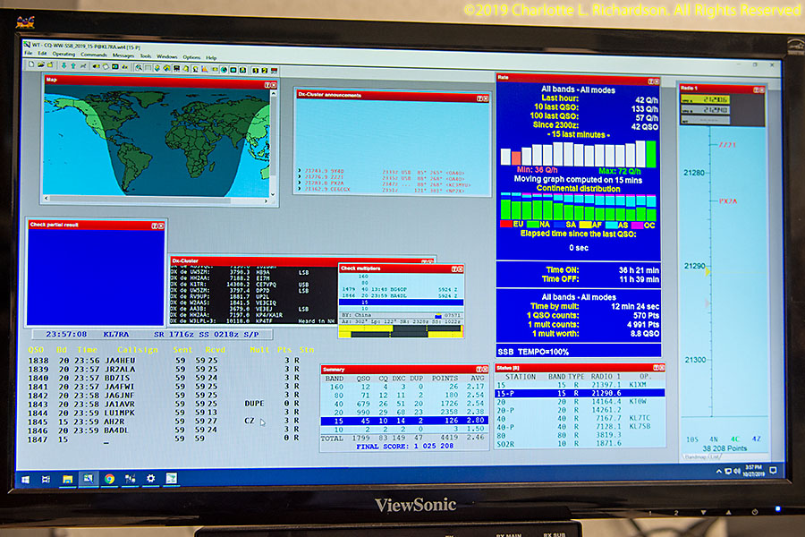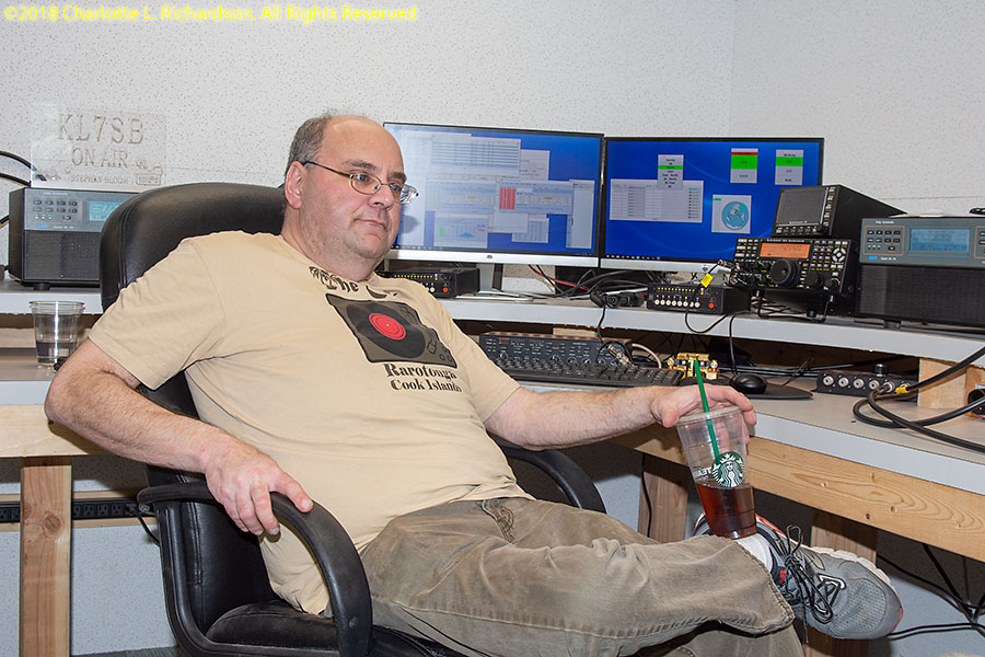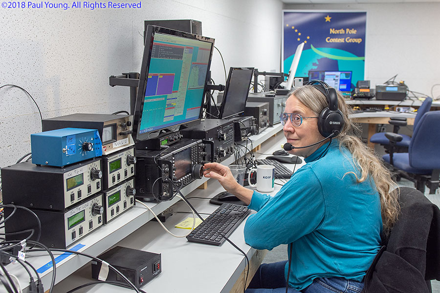 There were nine operators for the contest: KQ1F (Charlotte Richardson), KA1NCN (Dave Case), K1XM (Paul Young), KL7SB (Steve Bloom), KL0R (Wigi Tozzi), N6TR ("Tree" Tyree), KL7TC (Bill Hunstein), KT0W (Nick Hauser), and N5ZO (Marko Myllymaki). Before the contest, Wigi had us test for inter-station interference and any other issues we might have. We were well-staffed and well-prepared.