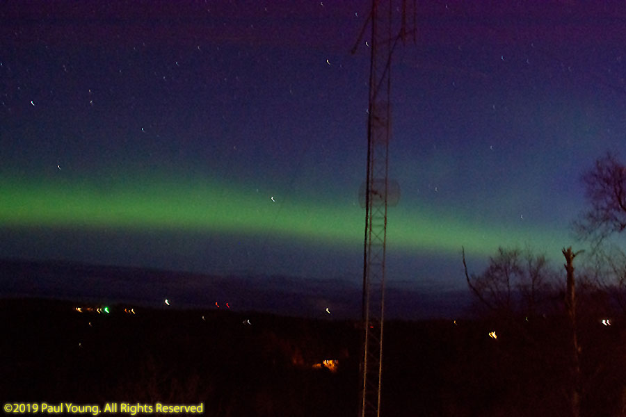 However, a coronal hole caused truly awful conditions for anyone operating from a high-latitude location like ours. The resulting aurora, when we had clear skies, was a beutiful bright green arc across the entire northern horizon, so bright that it was still visible well into twilight. At least Paul was finalluy able to photograph an aurora, though that was small consolation at the time.
