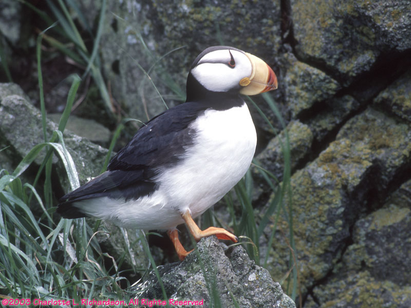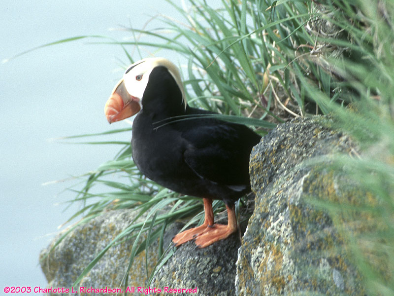 Tufted puffins, Fratercula cirrhata, nest in burrows at the top of cliffs.