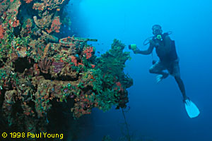 Diver and telegraph on the wreck of the Kiyosumi Maru, Chuuk, Micronesia |
