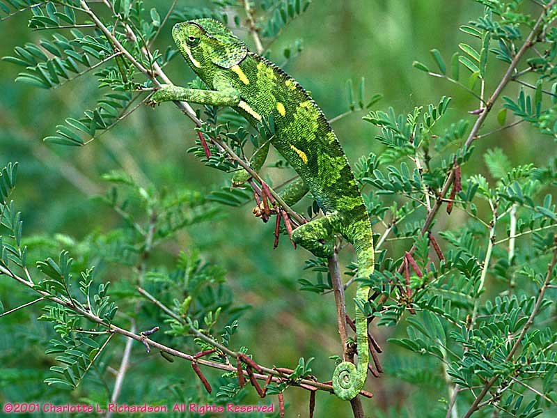 We were driving along in the western corridor of the Serengeti and our driver hit the brakes and said "Chameleon!". He backed up and sure enough, this chameleon was in an acacia near the road.