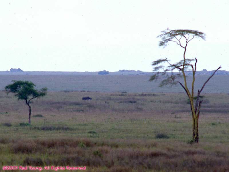 Two were in Serengeti Park. Seeing any there is extremely unusual. According to the park rangers there are only seven Rhinos in the entire park. Our driver has been leading safaris for sixteen years and this is the first time he's seen even one! They were both far away, but we had binoculars. I'm including a blow-up of a photo of one taken with our longest lens just because it is so rare. Look between the two trees, a little to the left of center. The saddest thing is, they used to be relatively common in the Serengeti, before poaching was widespread.