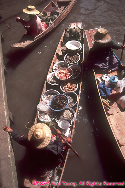 South of Bangkok, this floating market is mainly a tourist attraction these days. Most of the canals have been filled in. Also called Damnoen Saduak, it is about 100 km southwest of Bangkok. King Rama IV had the 32 km canal built, and many floating markets existed until road development reduced the need for water transportation.