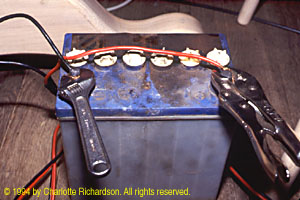 Car battery, removed from jeep and connected to radio with makeshift battery clamps. |